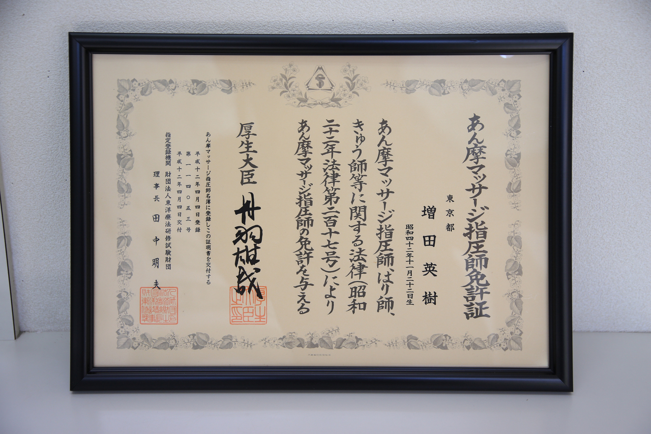 はり師、きゅう師、柔道整復師、あんま指圧マッサージ師の資格を持っていますので、安全な施術をご提供できます(今もって無事故で施術を続けております)。