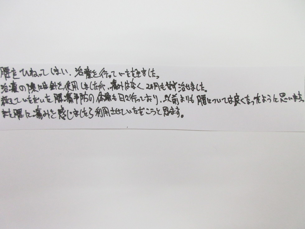 そこで当接骨院ではこれらの問題点を指摘させて頂き、腰痛にならない正しい体の使い方や体操を指導させていただきます。
